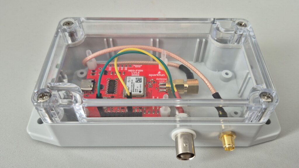 To use this module in an UltraMSK VLF receiver you need to bring out the PPS and GND signal to a suitable connector. You will also want an enclosure for the board. I used a small plastic box with a clear lid to allow the onboard power and PPS LED indicators to remain visible. I’ve wired the PPS signal, along with GND line, to a BNC connector. A short SMA extension cable was used for the antenna connection. For the USB-C connection, a suitable sized opening was made in the enclosure box. See photo below.